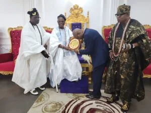 Present at the courtesy visit were Oba Kolawole Adegbola, the Otun Balogun of Ibadanland; Chief Muibi Ademola, the Aare Alasa Olubadan; and Chief Adegboyega Adegoke, the Aare Egbe Omo Balogun of Ibadanland, among others.
